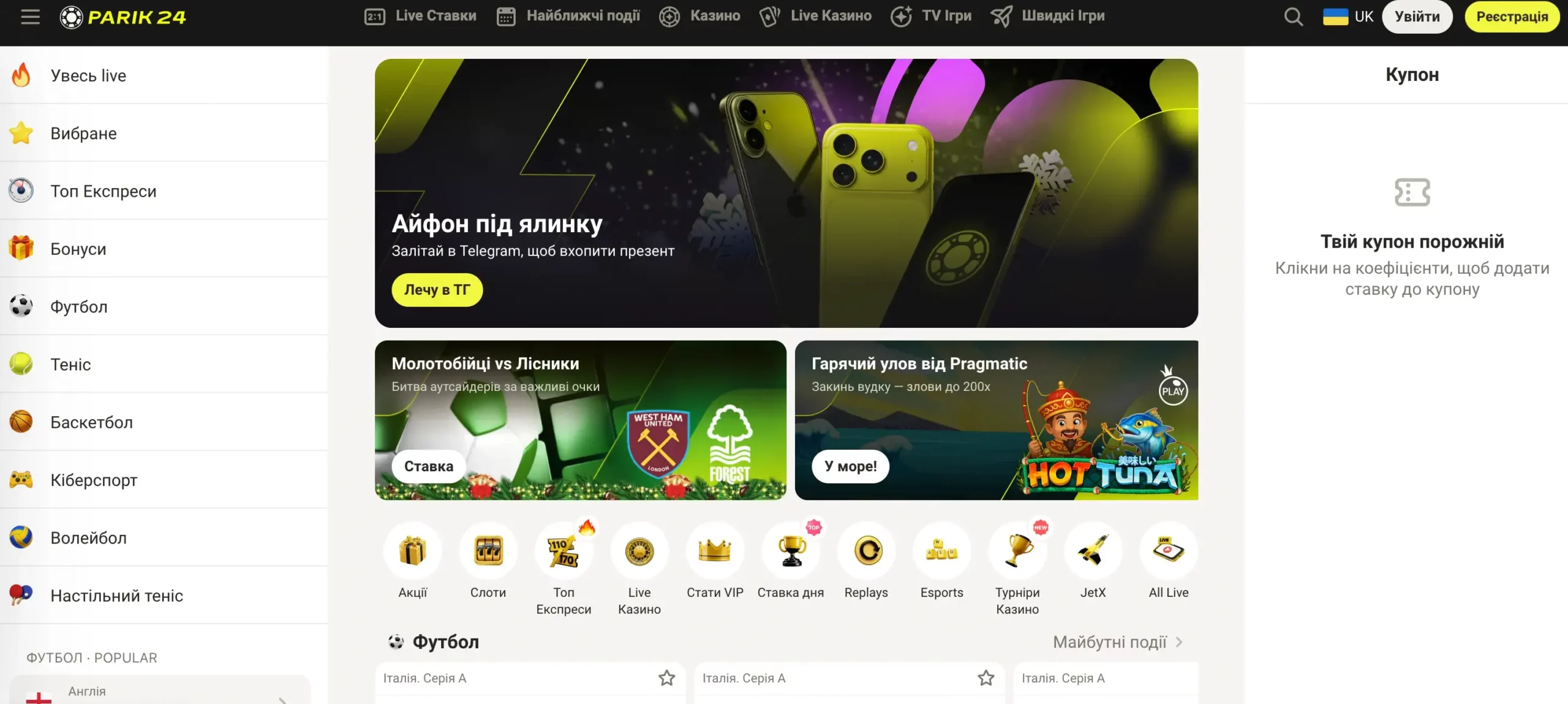 Parik 24 – це сучасна гемблінг-платформа, що стрімко набирає популярність серед українських гравців завдяки бонусній політиці та зручному мобільному інтерфейсу. Майданчик пропонує широкий асортимент розваг: від класичних слотів і швидких crash-ігор до професійних лайв-студій із живими дилерами та ставок на спорт.